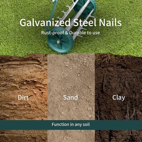 • Durable Steel Material: Made of durable steel, this manual lawn aerator is sturdy and stable. Rolling parts on both sides are made of PP, which is flexible and decreases the whole weight when working.